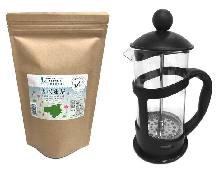 無農薬の古代ハスから作った『古代蓮茶』と、召し上がりの際に使っていただけるフレンチプレスのセットです。
